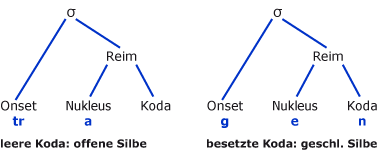 Silben sind in sich strukturiert und bestehen aus maximal drei Teilen: Silbenkopf (Onset), Silbenkern (Nukleus) und Silbenende (Koda). Minimal müssen im Deutschen der Silbenkopf und der Silbenkern besetzt sein. Im Silbenkern befindet sich das Segment mit der höchsten Sonorität (Vokale). Die Besetzung der Koda ist optional: Silben mit leerer Koda werden als offene Silben bezeichnet, Silben mit besetzter Koda als geschlossene.
